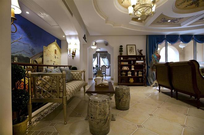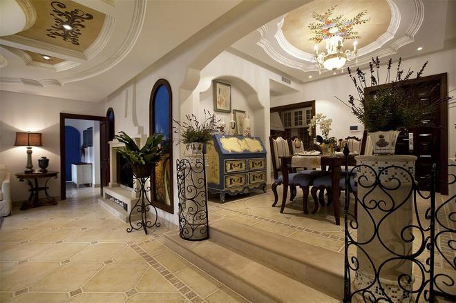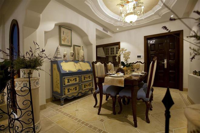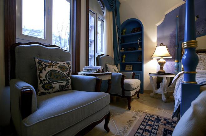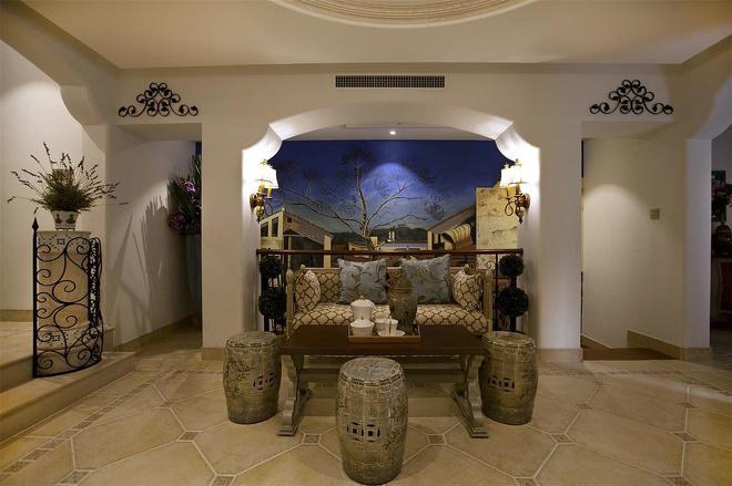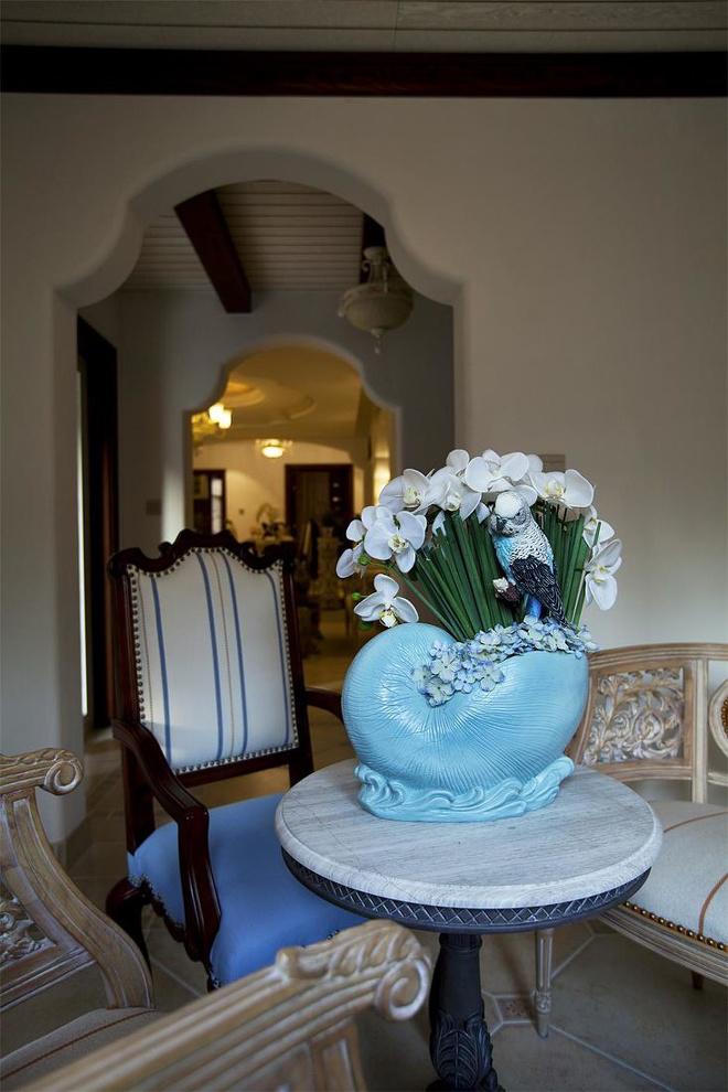 推門而入,普利亞南部薰衣草飄來的藍紫色香氣芬芳馥郁。海與天明亮的色彩干凈清爽,自然清新的玄關,色彩淺淡的地板和淡色的墻壁相呼應。客廳中充斥著拱門和馬蹄狀的造型,家具也以藍色以及木色為主色調,且多是線條簡單修邊渾圓的木質家具。部分家具特意擦淡做舊,表現出自然清新的感覺。